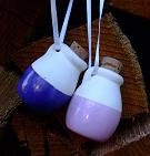 Small Ceramic Corked Pot - White on top half and glazed on bottom to hold in Essential Oils. These pots come in assorted colors (mainly pastels: pinks, greens, yellows, and a darker blue as shown in the picture). You can call us to request a specific color, and we'll do our best to match, but color availability does vary. These diffusers are jug shaped with neat little loop and ribbon to either sit on flat surface or be hung from hook. Unglazed on top half to allow aromas to gently drift out. Perfect for bath or bedside table. Put in a few drops of essential oil for subtle aroma, and more if desiring a stronger aroma. Read more...