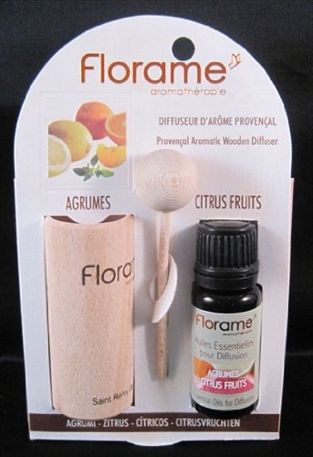 Florame's Aromatic Wooden Diffuser is the perfect tool to spread the scent of essential oils throughout a room. The oil rises the capllarity action into the wooden ball. Life span of this diffuser is about 3 weeks. Included in the set is the wooden diffuser holder, the wooden stick and the 10 ml bottle of essential oils. Citrus blend includes: Grapefruit, Orange*, Lemongrass*, Japanese Laurel, Bergamot*, Lemon*, Mandarine*, Geranium, Mentha piperita (Mint)*, Peruvian Balm, French Basil*, Tropical Basil*, Cumin.100% Pure and Natural. The oils marked with an * are certified organic by Ecocert.Avoid contact with skin and keep out of reach of children.The wooden diffuser has a small velcro piece that allows the diffuser to be secured to a backsplash in bathroom, fridge or pantry wall. Read more...